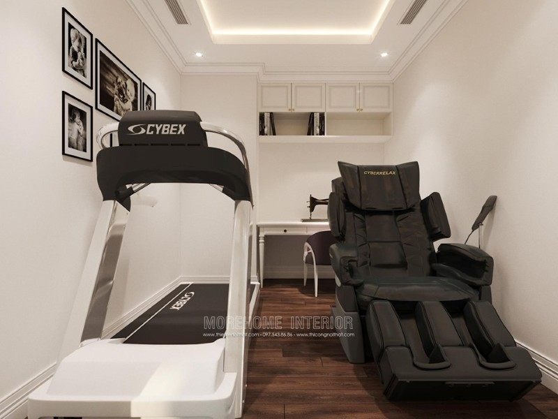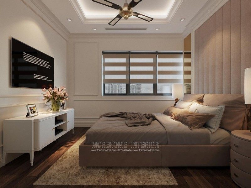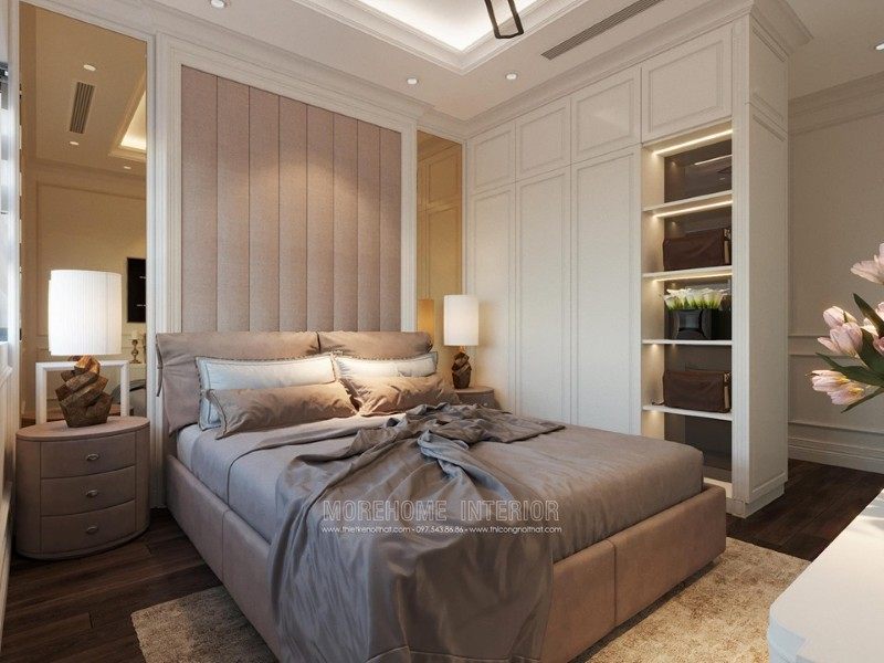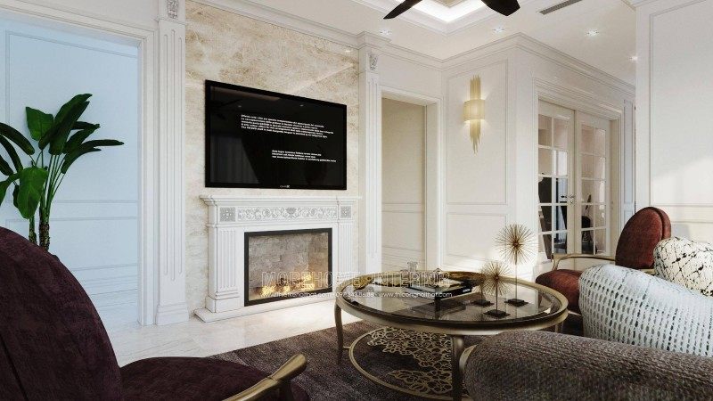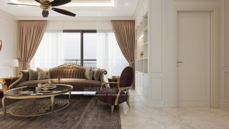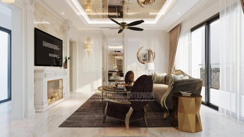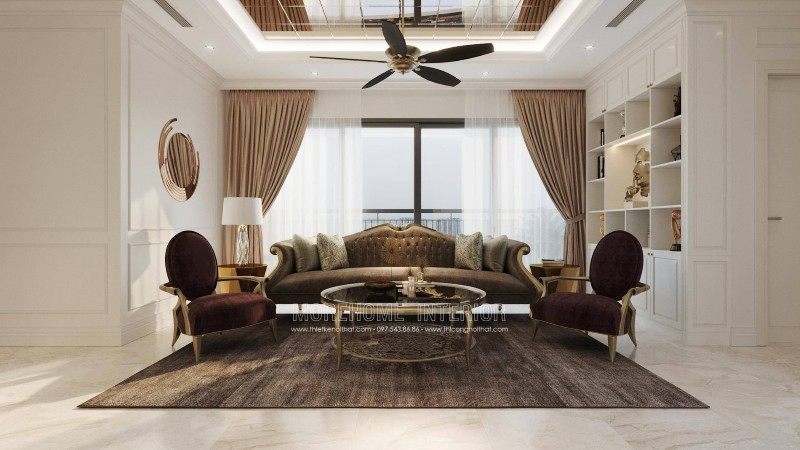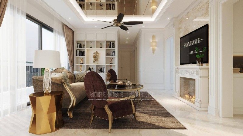 The rooms uses high-end neoclassical interior design, high-end and luxury furniture models with a harmonious combination with high-end gold-plated details. The brown-gray neoclassical sofa set is made of high-grade gold-plated iron-frame felt felt sofa with detailed meticulous and luxurious details. Next to the long sofa are 2 purple sofas with gilded iron frames. A gold-plated iron tea table combined with a glass table top brings a highlight to the living room space. Neoclassical interior design always gives the room a novelty in interior details. Two unique gilded wooden podiums placed on either side of the long sofa bring comfort to the room.