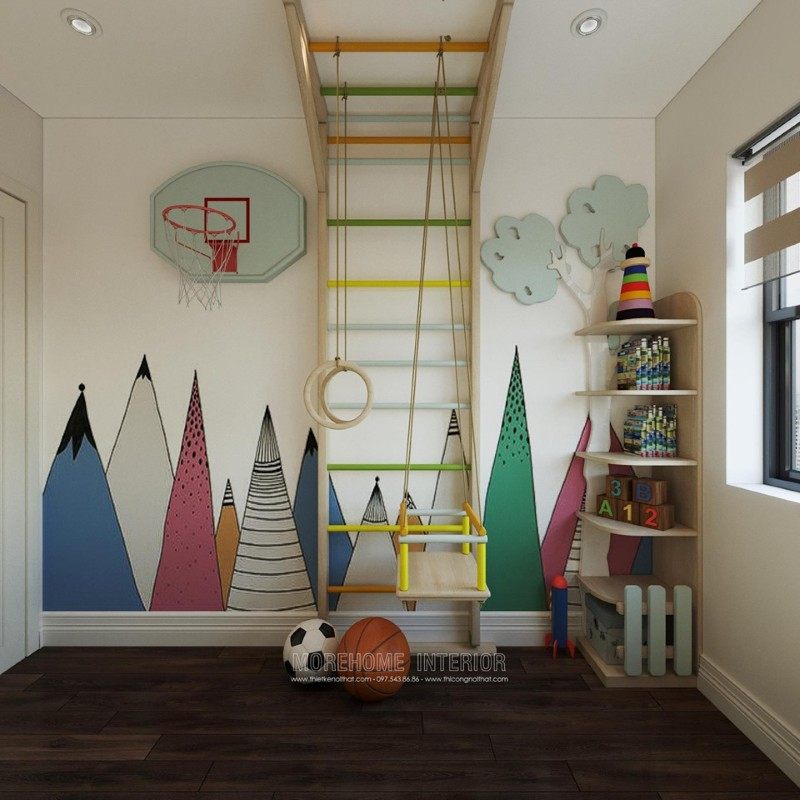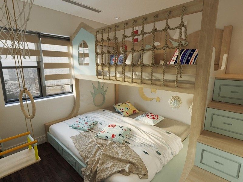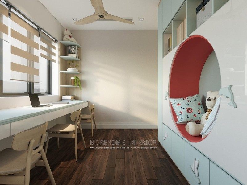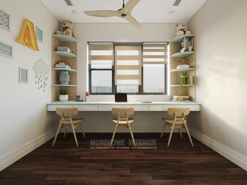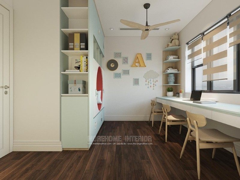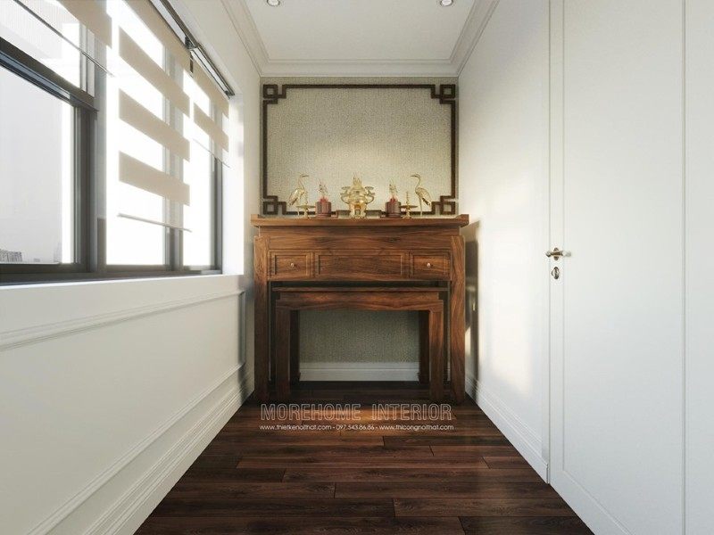 The rooms uses high-end neoclassical interior design, high-end and luxury furniture models with a harmonious combination with high-end gold-plated details. The brown-gray neoclassical sofa set is made of high-grade gold-plated iron-frame felt felt sofa with detailed meticulous and luxurious details. Next to the long sofa are 2 purple sofas with gilded iron frames. A gold-plated iron tea table combined with a glass table top brings a highlight to the living room space. Neoclassical interior design always gives the room a novelty in interior details. Two unique gilded wooden podiums placed on either side of the long sofa bring comfort to the room.
