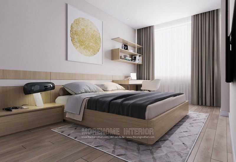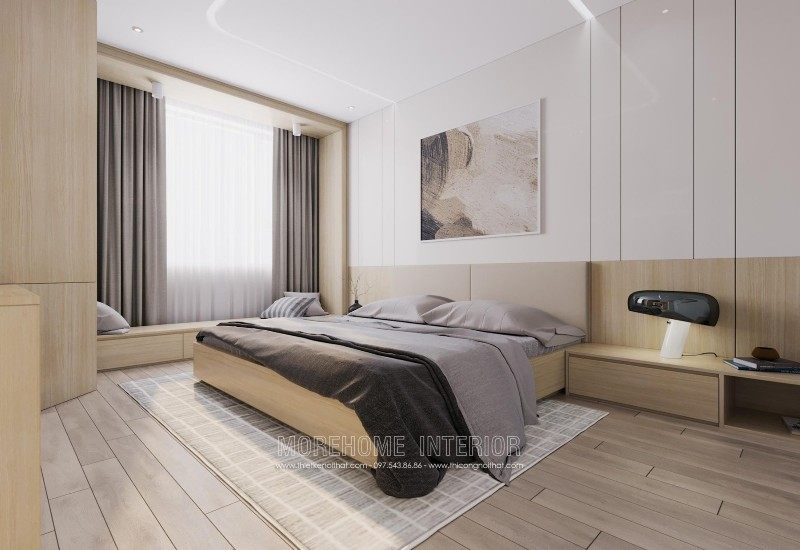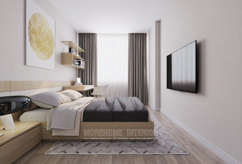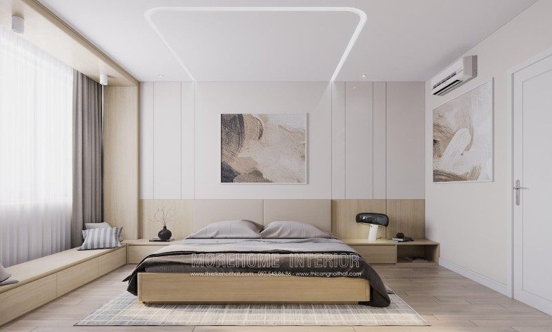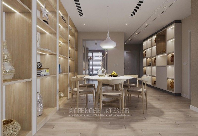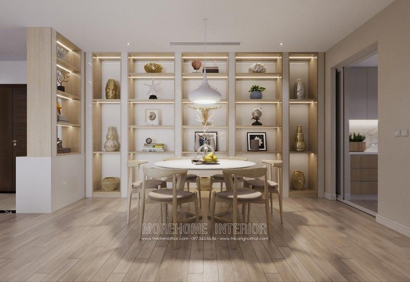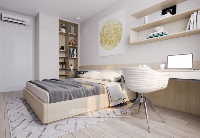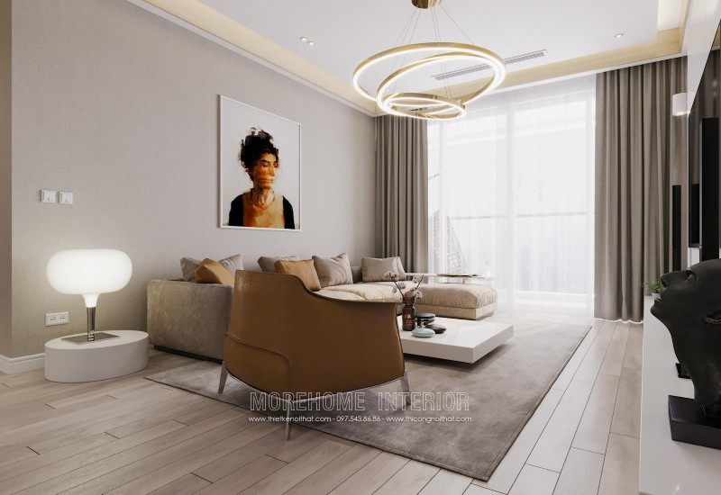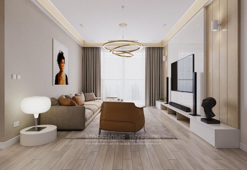 Modern interior design of Mandarin Garden apartment with milky white colors. Coming to this design, you will get a simple, beautiful and modern apartment space. This design is designed mostly with industrial materials such as industrial wood, fabric sofa, decorative lights, ..
