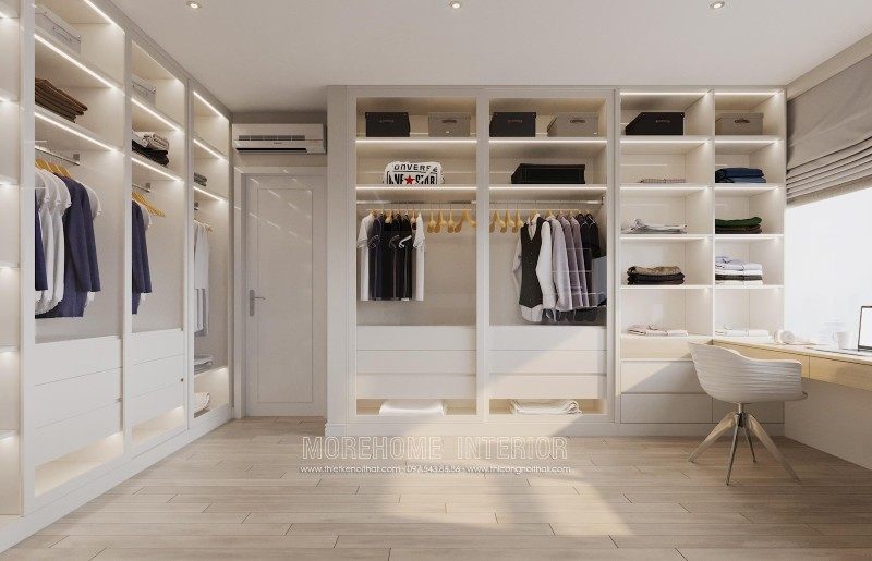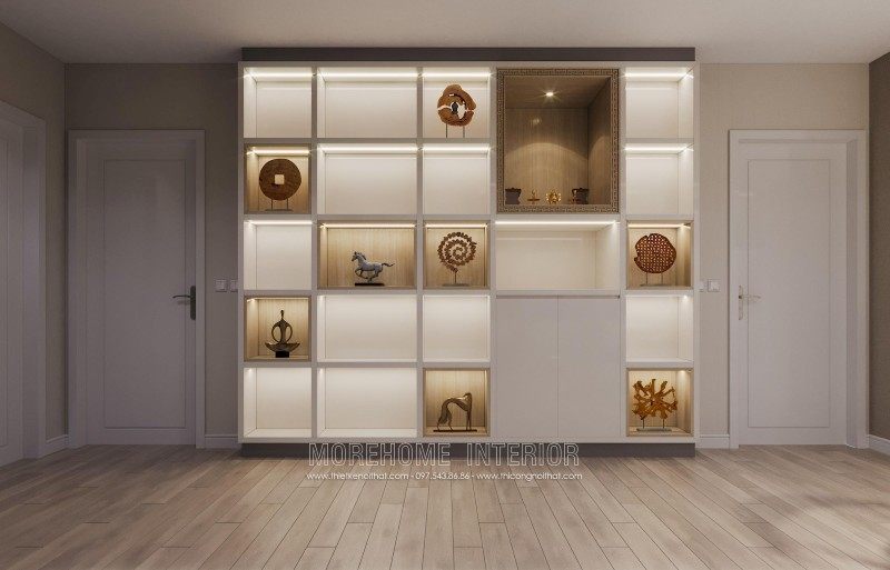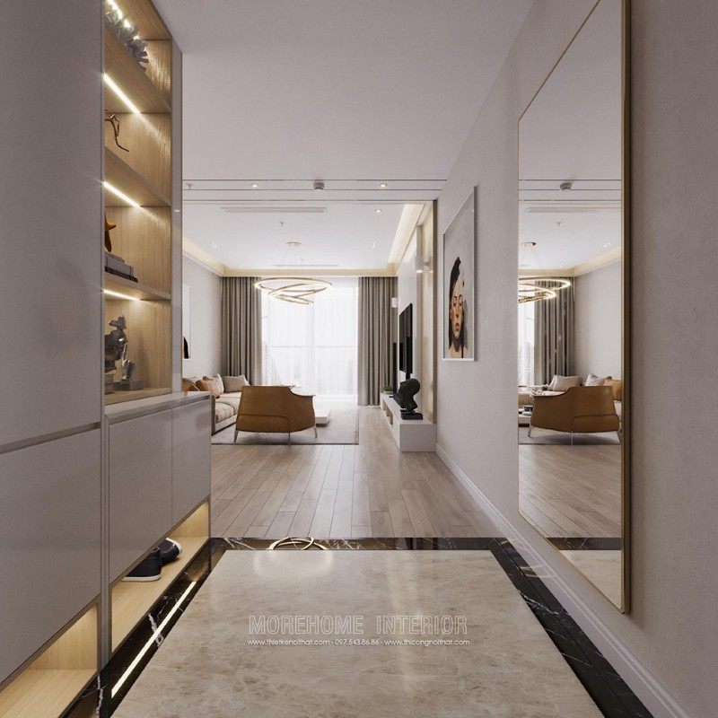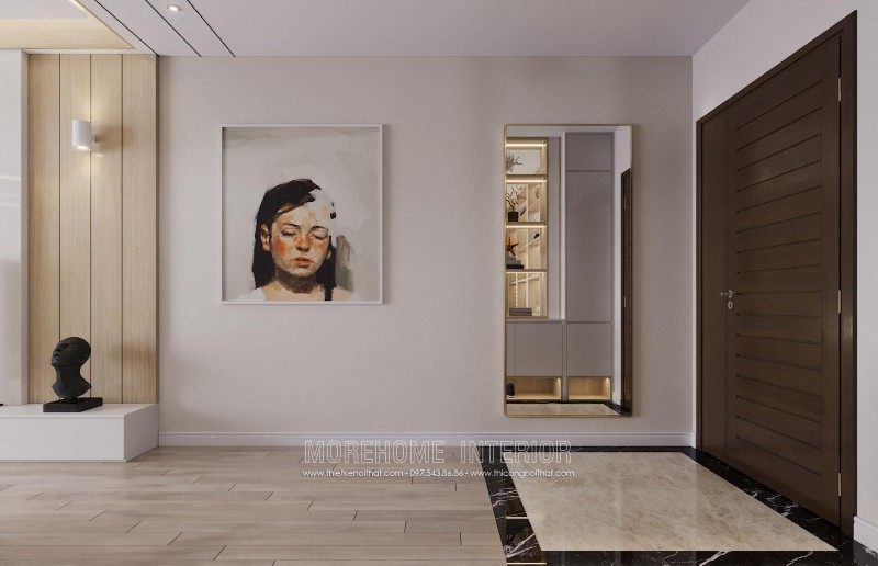 The interior design of the apartment is modern, so when you step into the apartment you will feel the modernity. One side of the wall is fitted with a large mirror to create larger space effect, opposite is a system of shelves for shoes and book bags made of industrial wood material.