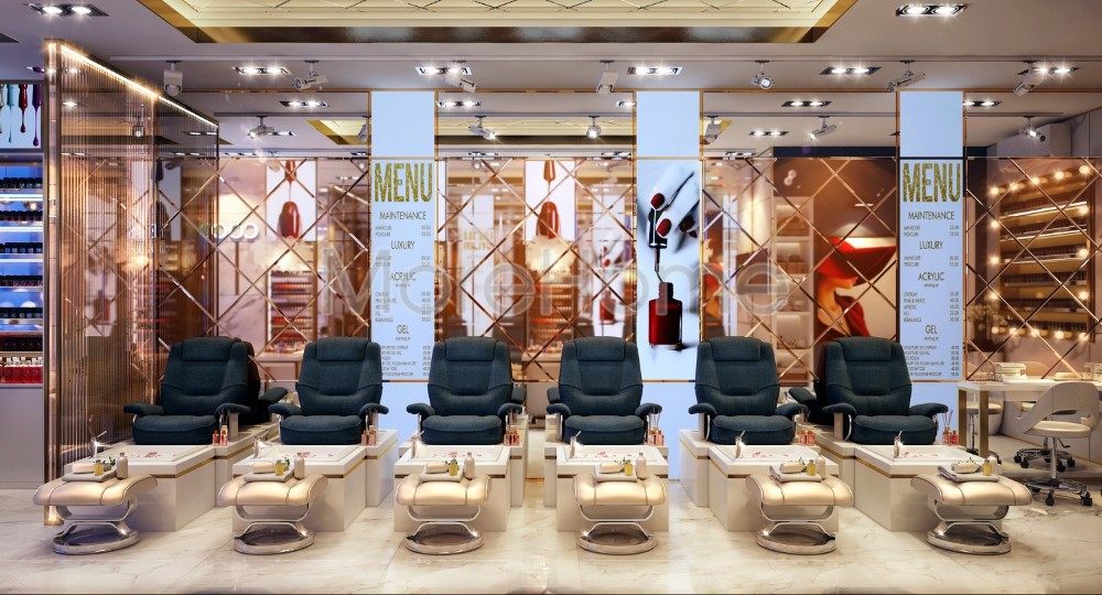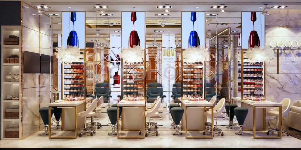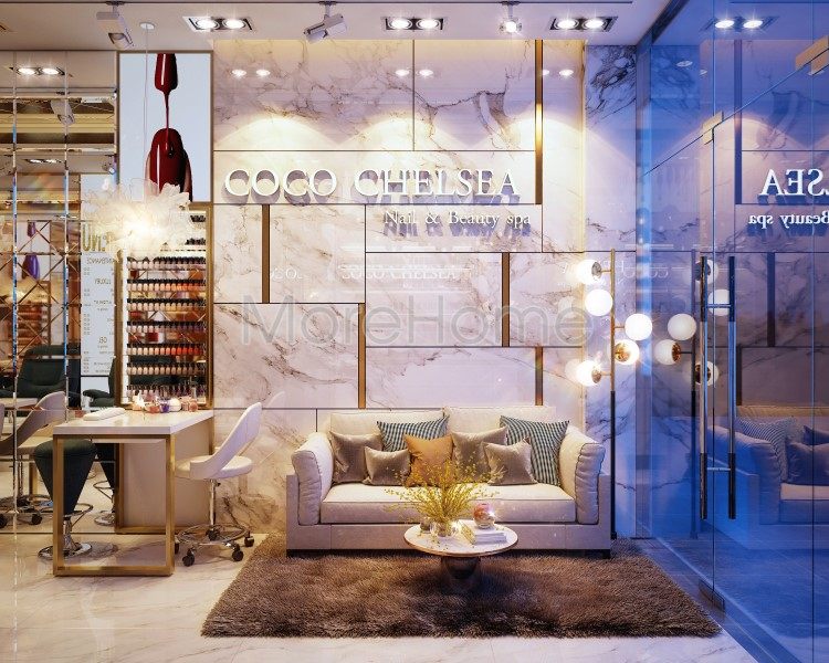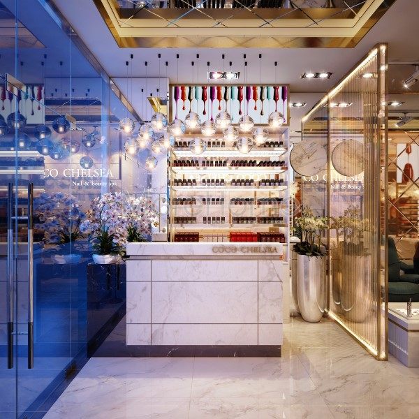 In the design of Coco Chelsea nail salon and Spa - London, we can easily recognize the first feeling that this space brings is luxury and modernity. Light as well as color is the main attraction of this space. How to use the light is of utmost importance in the interior design of the shop. Light is almost the most important factor determining the success of an architecture. Thanks to the proper light coordination, we can easily attract customers, and above all, bring comfort and relax feeling to customers. In addition, the materials used in the design are also very important, the use of lightweight materials like in the design of Nails Coco Chelsea helps the light to maximize its strengths.