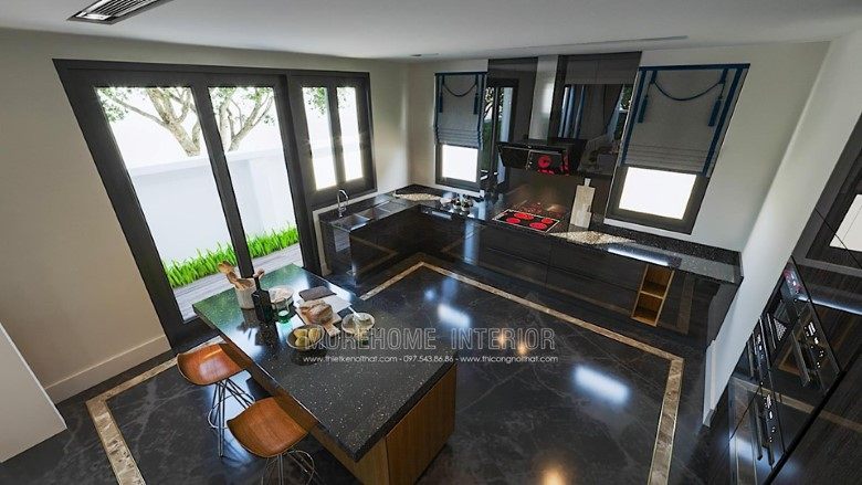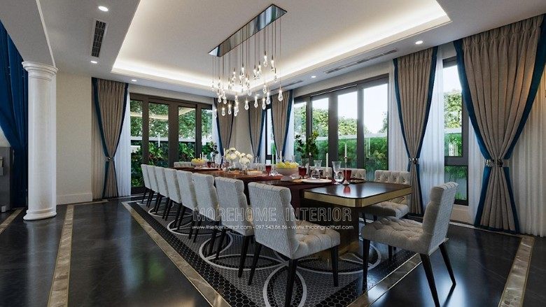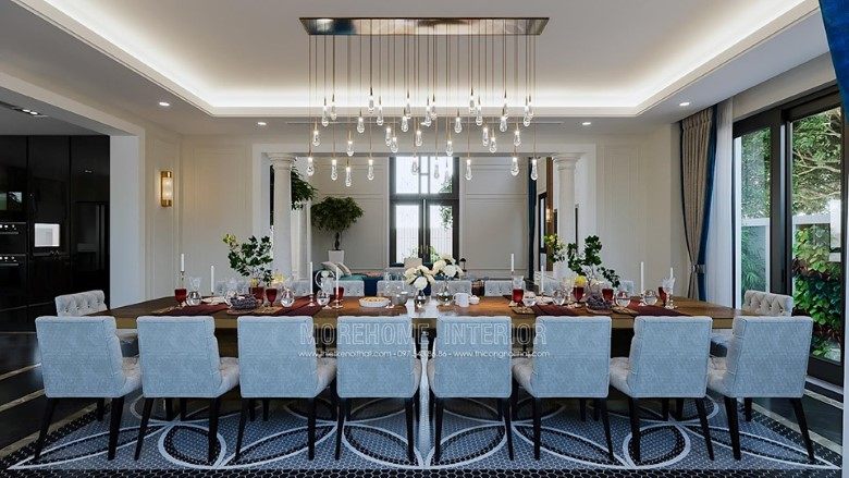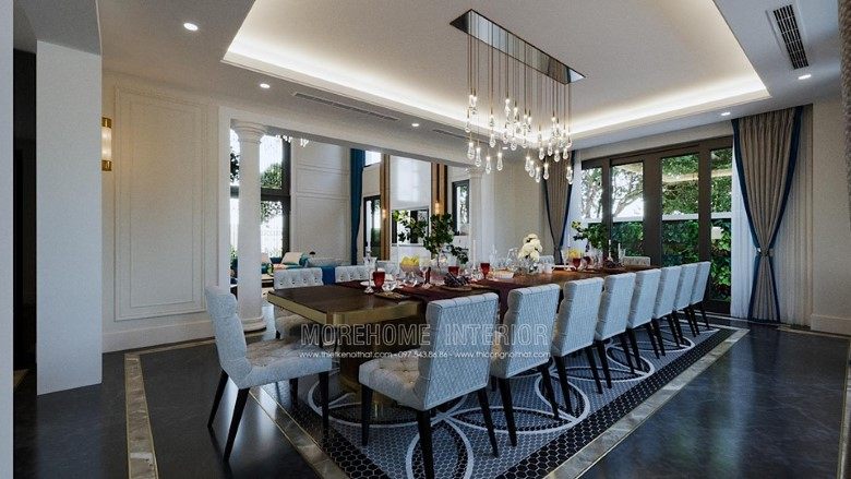 Entering the dining room space you will be surprised with the dining table set. The villa is spacious so the room spaces are widely arranged, this 10-person dining table is placed in the middle of the space between the dining room and the kitchen. The dining table is made of high quality natural wood, solid wooden legs, the dining chair is designed with wooden legs covered with gray felt padding to bring delicate softness to the occupants. This dining room lamp pattern is simply selected but brings warmth and splendor to the dining space.