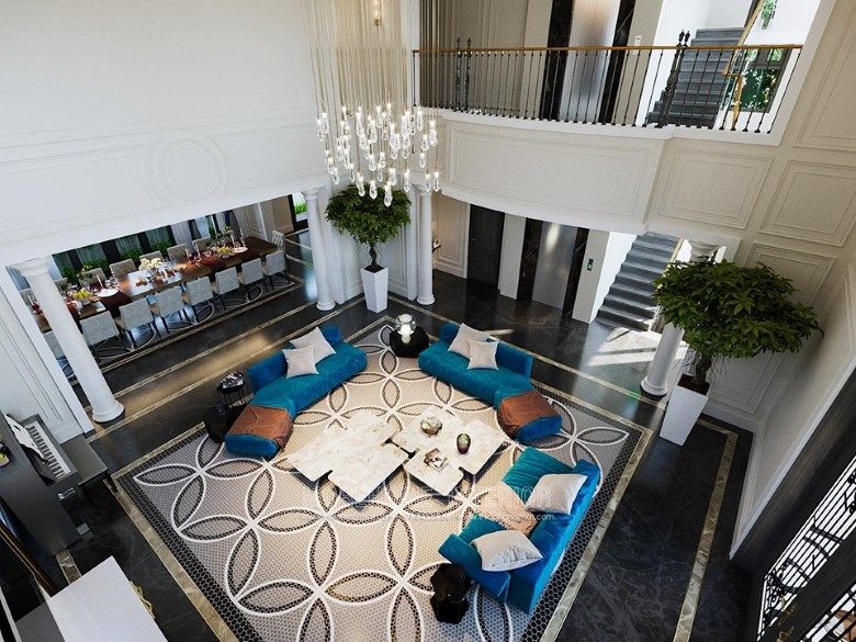 Stepping into the living room of the villa, you will see the ventilation and spaciousness brought by the high ceilings. Blue felt sofa is placed in the middle of the living room space to bring out the highlight and impression. Living room space is more lively with outstanding marble floor tiles. Spacious living room arranged by sofa set and rattan artificial stone tea table makes living room space no longer empty.