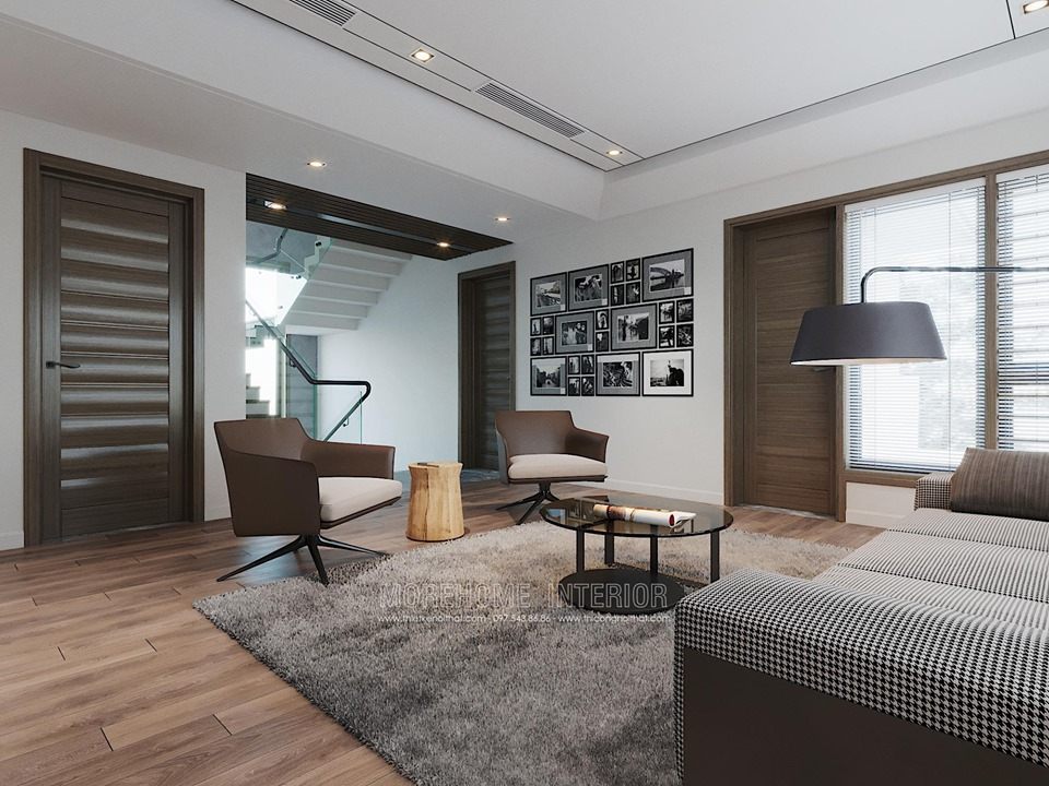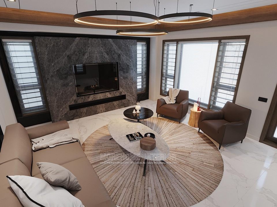 Modern living room with modern brown leather sofa is placed in a small living room space on the 1st floor. The unique, fancy and smooth dry leaf-shaped carpet makes dividing the room more modern. The accent wall panel is covered with high-end LG artificial stone in dark color to bring sophistication to the room. Modern 3-ring LEDs make a delicate contribution to the living room space of this house. Modern level plaster ceiling makes the living room more splendid. The living room is designed with Korean style with minimalist but comfortable furniture.