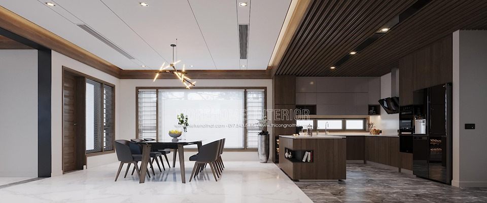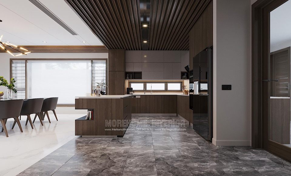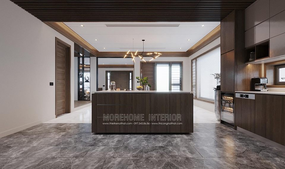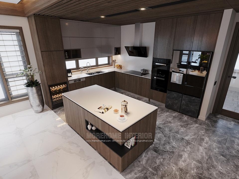 Multi-purpose kitchen with kitchen cabinets and high-end kitchen equipment. Kitchen cabinets are made of industrial wood, imitation of a warm, friendly chocolate brown wood grain. White LG artificial stone combined with chocolate brown color creates a delicate and harmonious cooking space. The large and sturdy kitchen bar helps to arrange food comfortably and delicately.
